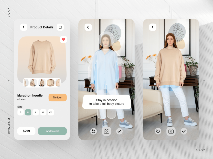 Experience the future of online shopping with this innovative AR-enabled fashion app. this user-friendly interface allows customers to seamlessly browse through a chic collection of apparel. With the cutting-edge 'Try it on' feature, users can instantly visualize how clothes look on them through their device's camera, ensuring the perfect fit and style from the comfort of their home. The app's design is not only aesthetically pleasing but also intuitive, making shopping a delightful and efficient experience.